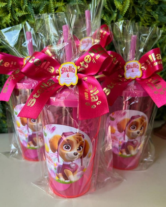 Copos lindos de 500ml com adesivo lavável, personalizado no tema da festa, finalizado com um lindo laço, eternizando esse momento incrível!